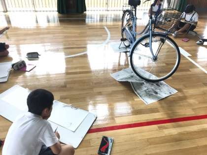 体育館に集まって、本物の自転車を前に、「夢の自転車」を描きました。