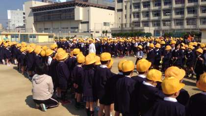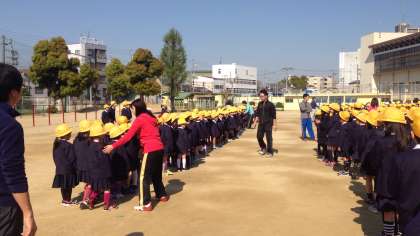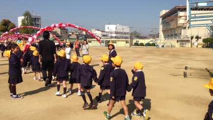 1年生が、児童会の代表児童が作る花道を通って、全校のみんなと初対面です!