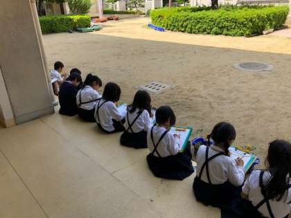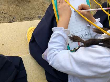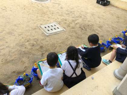 葉を手で触った感触を調べたり、においをかいだりしました。そのあとに観察カードに苗の様子を絵と文で記録しました。子どもたちは探検ボードを使って、集中して頑張ってかいていました。