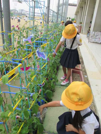 あさがおの花がたくさんさきました。期末懇談の時に、お家の方に持って帰ってもらいます。夏休み中も大切に育ててくださいね。