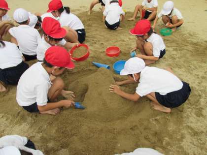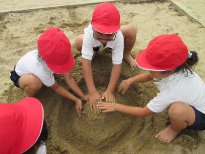 裸足になって砂場に入った子どもたち。「気持ちいい!」「あったかい!」と口々に言っていました。班の友だちと山をつくったり、トンネルを掘ったり、山どうしを川でつないだりと、いきいきと活動することができました。