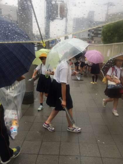 今日は雨の中、6年生の有志と教職員で小学校前の清掃を行いました。