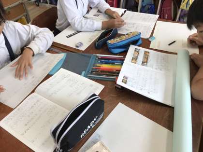 1人1人が和太鼓に関することを調べ、国語科で学習した「新聞記事を読み取ろう」「資料を活用しよう」をもとにグループでまとめて大型新聞を作成しています。
