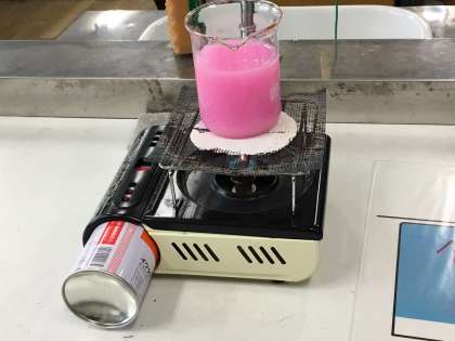 理科の学習で、「水はどのようにして全体が温まっていくのだろうか」という実験をしました。示温インクを溶かした水を使って、水温が上がっていく様子を観察しました。さて、ビーカーの中の水はどのようにして温まったのでしょうか。答えは4年生の児童に聞いてみてください!