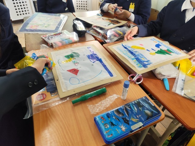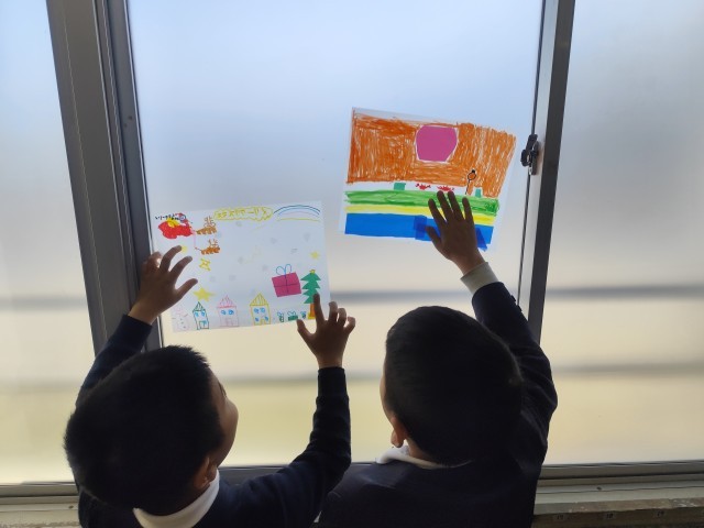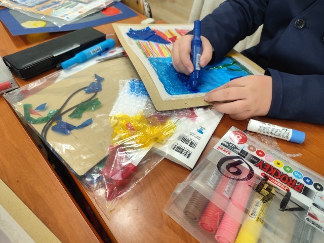 「どこに貼るときれいに見えるかな」「どの色を合わせたらいいかな」など、カラーシートやエアキャップの使い方を工夫して制作に取り組みました。作品のイメージを持ちながらする子どもたちや、感性のまま材料の組み合わせを楽しむ子どもたちで、とっても素敵でした。
