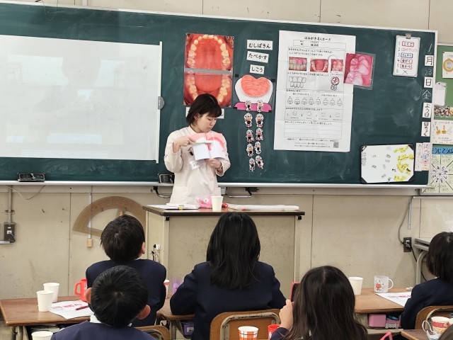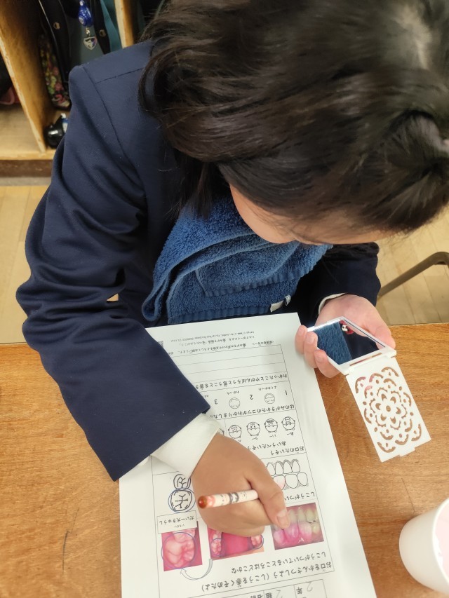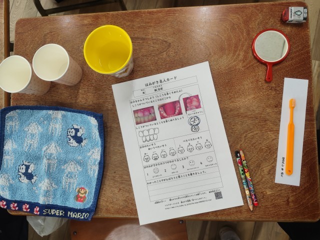 今日は歯磨き指導があり、歯の正しい磨き方を学習しました。