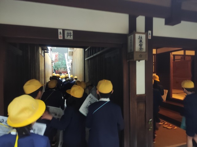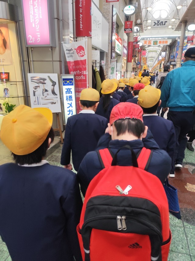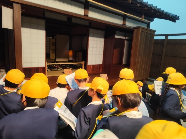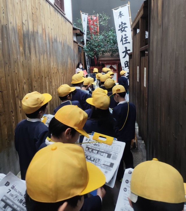 社会見学で、大阪くらしの今昔館に行きました。昔の大阪市の町並みや暮らしを実際に見て学ぶことができました。江戸時代の大阪の町が実物大で再現されており、「江戸時代にタイムスリップしたみたい!」「この店何売ってたんやろ」と、ワークシートを片手に興味津々に見学する姿が見られました。大阪くらしの今昔館までの道中に、以前社会科で学習した、日本一長い商店街として知られる天神橋筋商店街があり、「ほんまに長いんやなあ」と圧倒されている様子でした。