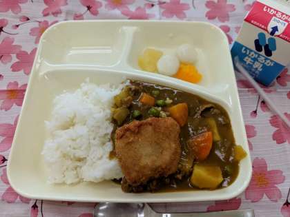 4月9日(火)、今年度最初のこんだては「カツカレーライス、フルーツ白玉、牛乳」です。