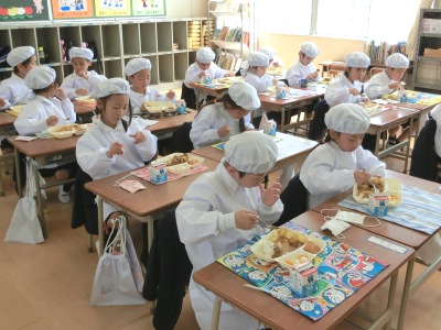 1年生は小学校で初めての給食です。給食の受取りから配膳までは、すべて6年生にしてもらいました。「おいしい」「辛いけどおいしい」と言いながら、みんな大好きなカツカレーライスをしっかり食べていました。おかわりしている児童もたくさんいました。これから卒業まで、いろいろな給食が出ます。たくさん食べてくださいね。