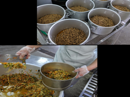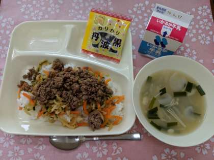 ビビンバも給食で人気のメニューです。野菜のナムル(今日はにんじん、きゅうり、切り干しだいこんです)と、ひき肉を別々に調理し、ごはんの上にのせてまぜて食べます。1年生もおいしかったようで、おかわりをしすぎて食べきれなくなってしまった人もいました。