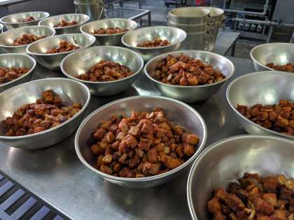 まぐろのオーロラ煮は、揚げたまぐろに、ケチャップと赤みそのたれがよくからんだ、人気のこんだてです。ごはんにもよく合います。1年生もおかわりして、全クラス残りはゼロでした。