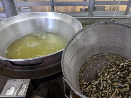 焼きとりは、串には刺さっていませんが、鶏肉と大きめに切った白ねぎを焼いて、タレをかけて仕上げます。みそ汁のだしは、今日は煮干しでとっています。