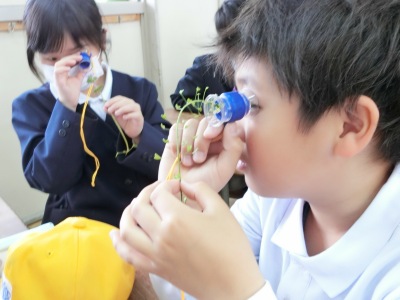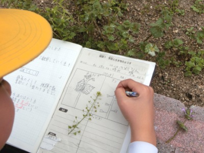 運動場南側の「学習園」のところに生えている「ホトケノザ」と「ナズナ(ペンペン草)」の観察をし、スケッチをしました。その後、教室に戻ってルーペで拡大をして観察をしました。肉眼で見えなかった蜜や毛、種、アブラムシなどを見つけることができました。ホトケノザをルーペで見ると、仏様の顔のように見えた児童もいました。