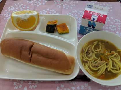 4月19日(金)のこんだては「カレースープスパゲッティ、焼きかぼちゃ、あまなつかん、おさつパン、牛乳」です。