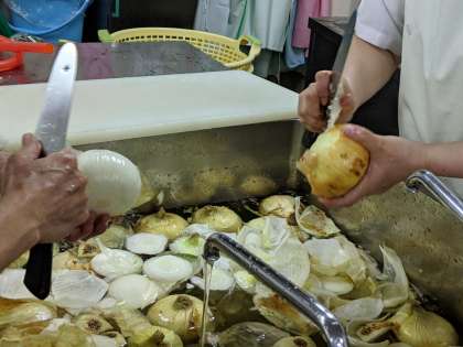 豚肉のおろしじょうゆかけは、豚肉とたまねぎを焼いて、だいこんおろしのたれをかけています。たれにはゆず果汁を使用して、さっぱりと仕上げています。この時期に使用するたまねぎは、春に収穫される新たまねぎです。いつもより水分が多く、やわらかいのが特徴です。