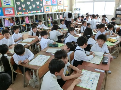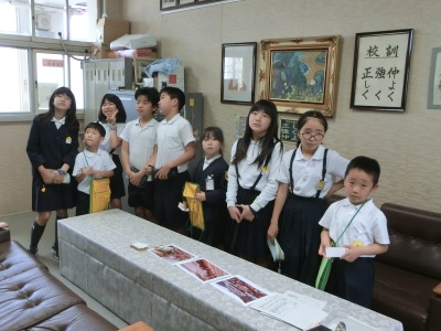 1年生がこれから勉強や用事がある時に困らないよう、特別教室や図書室、職員室、管理作業員室など、学校生活に関係があるたくさんのところをまわりました。校長室には各班ごとにやってきて、校長先生とごあいさつをして「名刺交換」【写真中】をしました。各教室にかくされた8つのキーワードを探して言葉をつくり、教室に戻って答合わせをしました。