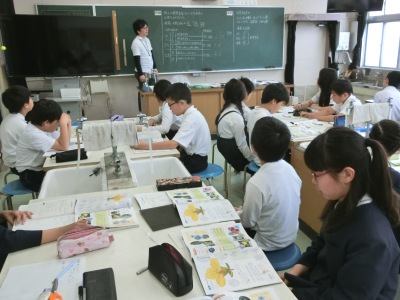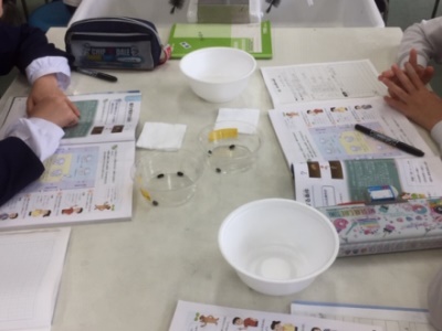 4月24日(水)2限、5年生は理科室で「植物の発芽と成長」の授業をしていました。種子が発芽するには、「水・空気・適当な温度」のどんな条件が必要なのかを実験をしました。