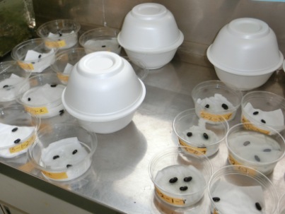 カップに脱脂綿をいれ、インゲンマメの種子を入れて、ア:水あり・なし、 イ:空気にふれる・ふれない ウ:温度があたたかい・冷たいの6つに分けました。発芽実験の結果は、10連休GWあけにわかります。