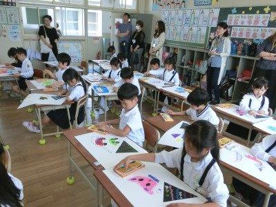 1年生の3クラスは、図工「とびだせ だいすきなもの」の授業を行いました。クラッカーからだいすきなものが飛び出した様子を想像して、パスを使って上手に描いていました。