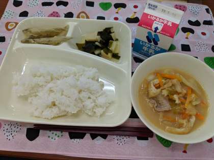 5月10日(金)のこんだては「きびなごてんぷら、豚汁、わかたけ煮、ごはん、牛乳」です。
