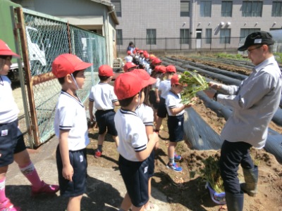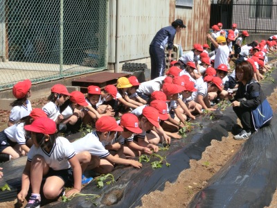地域の方から苗の植え方を教えてもらった後、「鳴門金時イモ」の苗を受け取って、一人ずつ植えていきました。サツマイモは根っこが成長してできることや、縦に植えると丸いサツマイモができることも教えていただきました。子どもたちは、今から秋のイモ堀りを楽しみにしています。