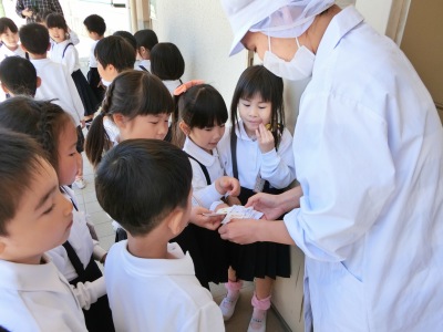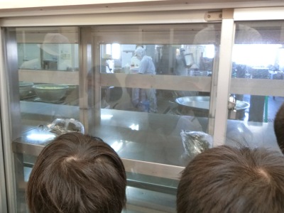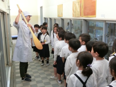 5月8日(木)3限、1年生は3回目の「学校たんけん」で、給食調理室を見学に行きました。