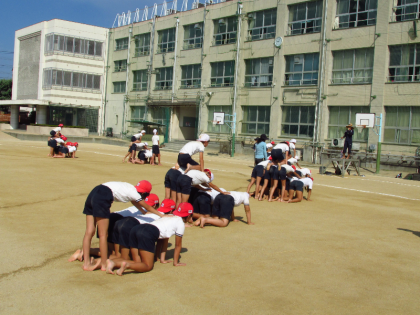 運動会の最後を飾る6年生の組み立て体操。今日は、サザンやゆずの曲に合わせて、一人技から二人技、三人技…と練習を繰り返していました。子どもたちと一緒に先生たちも裸足になって気合十分です。怪我のないようにして、技を決めていけるといいですね。感動のフィナーレを!6年生!!