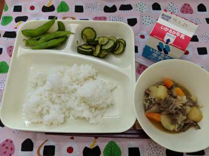 5月15日(水)のこんだては「肉じゃが、きゅうりのかつお梅風味、えだまめ、ごはん、牛乳」です。