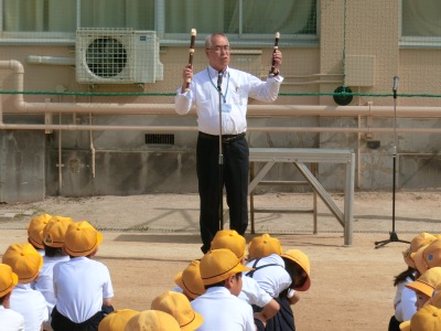 5月20日(月)始業前の児童朝会は、校長先生がリコーダーを吹いた後、「ドレミ」はイタリア語というお話がありました。