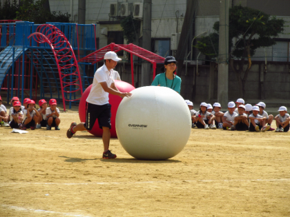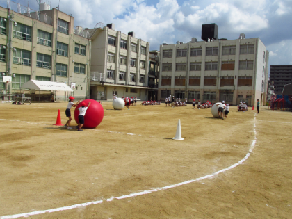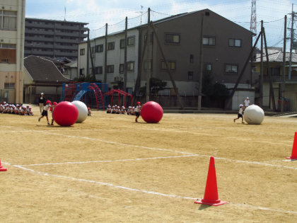 2年生の団体競技は、大玉ころがしです。自分の身長ほどもある大きな玉を二人で押して走ります。先生たちのお手本の後、初めてやってみましたが、前が見えないのでまっすぐ進むのもむずかしそうでした。一緒に転がらないように気をつけてくださいね。