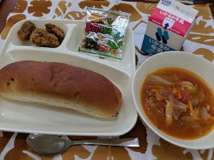 5月27日(月)のこんだては「一口トンカツ、ミネストローネ、豆こんぶ、レーズンパン、牛乳」です。