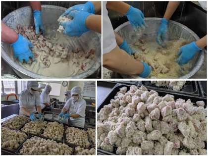一口トンカツは、一口サイズの角切りの豚肉を使用した、手づくりのトンカツです。20kg以上の豚肉に、手際よく衣をつけていきます。豚肉には、料理用ワイン、塩、オールスパイスで下味をつけています。子どもたちにも大人気でした。