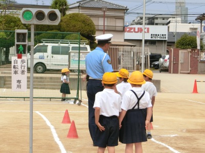 交通事故に遭わないために、信号機を使って、赤・青・黄信号のルールや標識の勉強をしました。その後、運動場に描いた道路や横断歩道を正しく歩く練習をしました。青信号でも右・左・右・右うしろを見て、安全を確かめるようにしましょう。