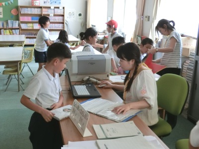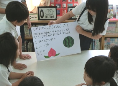 今週は、図書委員会が考えた「図書クイズ」もしています。問題は本のあらすじや登場人物、作者などのクイズでした。低学年の児童が、いつもよりたくさん来ていました。