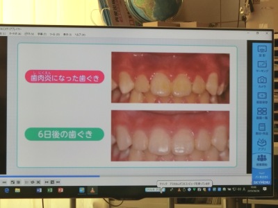 10〜14歳の34.5%が「歯肉炎」になっています。子どもたちはDVDを見ながら、歯垢(プラーク)や歯ぐきのサイン、歯みがきの基本について学習しました。歯並びにあわせた歯のみがき方やデンタルフロスの使い方など、とてもよくわかりました。