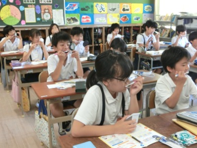 6月6日(木)午前、5年生は、学校歯科医の先生にも来ていただいて「第76回全国小学生歯みがき大会」に参加しました。日本とアジアを合わせて約24万人の小学生が参加します。教室でDVDを見ながら、歯と口の健康について、実習を通して楽しく学ぶ大会です。