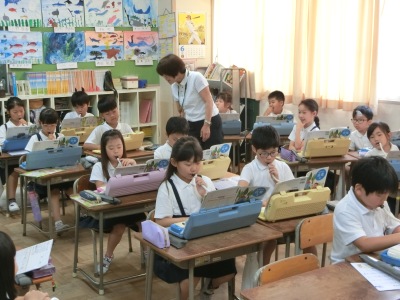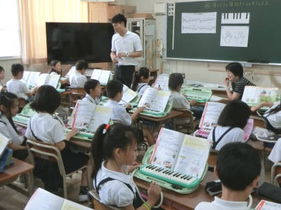 2組【写真中】と3組【写真右】は音楽の授業で「みんなで歌おう」の授業でした。鍵盤ハーモニカの指くぐりと指またぎを学習した後、「ドレミの歌」を演奏しながら歌いました。
