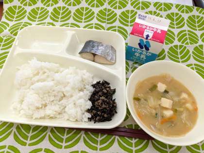 6月11日(火)のこんだては「さごしの塩焼き、みそ汁、牛ひじきそぼろ、ごはん、牛乳」です。