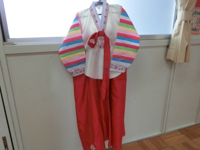 3限は1年生の多文化共生授業で、「こんにちは」(アンニョンハセヨ)のあいさつと、「ありがとう」(コマスムミダ)の言い方を教えていただいた後、韓国朝鮮の場所や衣装についても学習しました。