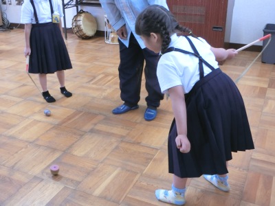 韓国朝鮮のジャンケン(カウィ・バウィ・ボ)では、担任の先生と対決し、勝った子は大喜びでした。こま(ペンイ)【写真右】では、実際に各クラスの代表の子どもが体験しました。初めてとは思えず上手に回している子もいました。手遊び(南大門ナムデムン)では、韓国朝鮮語の歌もすぐに覚え、友だちと楽しんでいました。どんどん早くなる音楽に、とっても盛り上がりました。