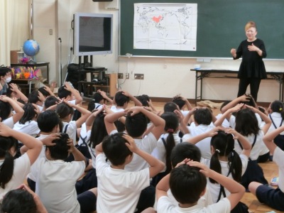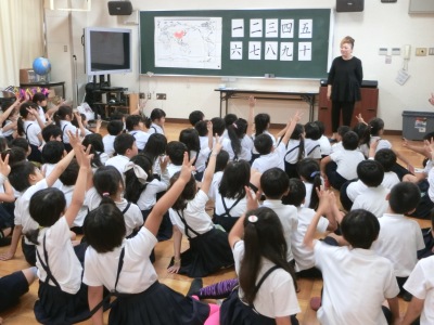 始めに中国語のあいさつを教えてもらい、代表児童が実際に先生とあいさつをかわしました。次に漢字の学習では、同じ漢字でも読み方が異なっていたり、仮名がないために簡単に書くようになったことを知りました。