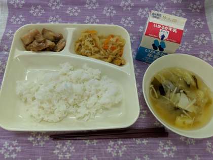 6月14日(金)のこんだては「鶏肉のしょうゆバター焼き、五目汁、切り干しだいこんのいため煮、ごはん、牛乳」です。