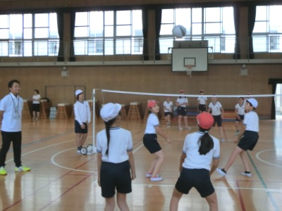 6月19日(水)5限、6年生では体育科の校内研究授業で「ソフトバレーボール」の学習をしました。教育センターから教育指導員の先生も来ていただきました。