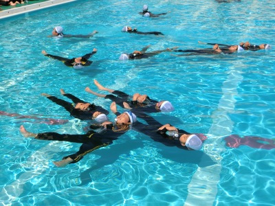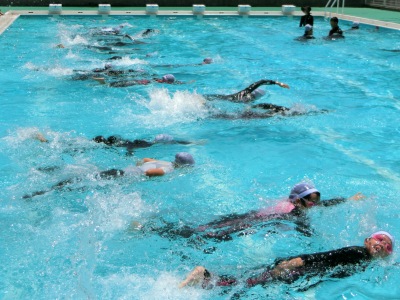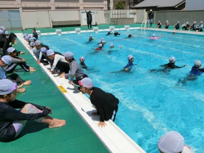 自分で用意した長袖シャツ・長ズボンを着て、プールに入りました。服を着たままプールの中を歩く【写真左】、服を着たままクロールで泳ぐ【写真中】、ペットボトルを抱いて浮く【写真右】などを体験しました。体力を消耗しないためにどうするのか、人を助けるときはどうするのかなど、様々なことを学習しました。今日の放課後は、教職員でプールの清掃と換水を行う予定です。