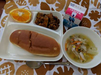 7月1日(月)のこんだては「かぼちゃのミートグラタン、スープ、オレンジ、おさつパン、牛乳」です。