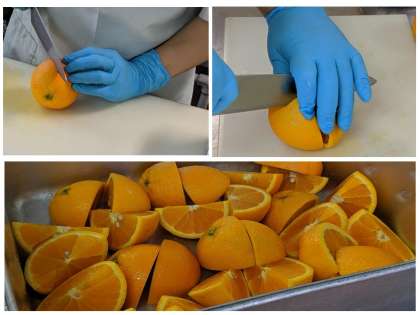 オレンジは、ひとり1/4切れずつです。ヘタに対して斜めに十字に切ると、切り口が揃った形になります。