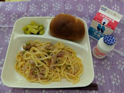 7月4日(木)のこんだては「ポークトマトスパゲッティ、グリーンアスパラガスのサラダ、発酵乳、1/2黒糖パン、牛乳」です。