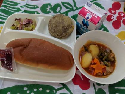 7月8日(月)のこんだては「チキンレバーカツ、ケチャップ煮、たことキャベツのソテー、コッペパン、いちごジャム、牛乳」です。