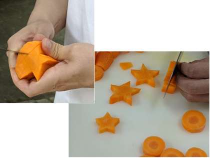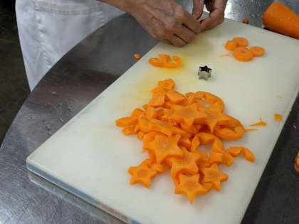 昨日は七夕だったので、今日のラッキーにんじんは星形でした。器用に手切りで星の形に切ったり、にんじんの太さに合わせて型で抜いたり、いろいろな大きさの星をたくさん作ってもらいました。