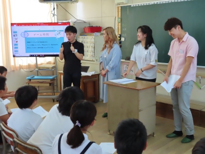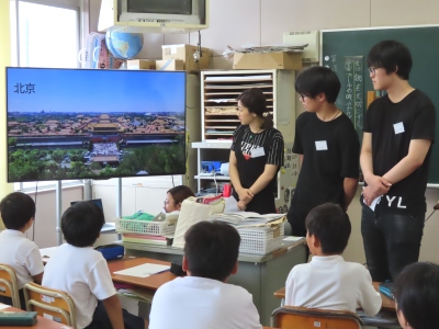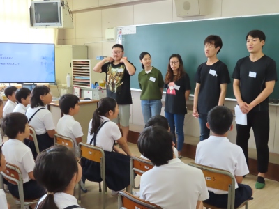 5年生は、各教室で「中国」の留学生と交流をしました。中国の紹介に始まり、中国語と日本語の漢字の違いや簡単なあいさつなどを教えていただきました。紹介していただいた映像は、それぞれのチームで作っていただいたオリジナルです。